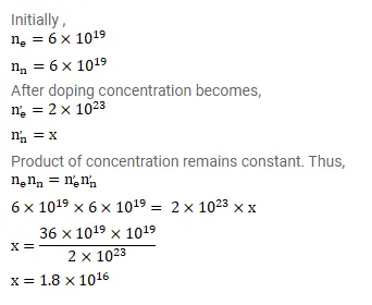 The product of the hole concentration and the conduction electron concentration turns out to be independent of the amount of any impurity doped. The concentration of conduction electrons in germanium is $6 \times 10^{19}$ per cubic metre. When some phosphorus impurity is droped into a germanium sample, the concentration of conduction electrons increases to $2 \times 10^{23}$ per cubic metre. Find the concentration of the holes in the doped germanium.