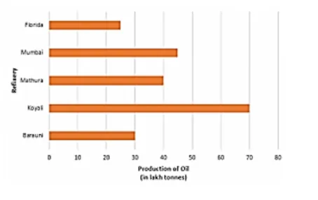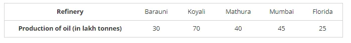 The production of oil (in lakh tonnes) in some of the refineries in India during 1982 was given below: