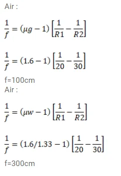 The radii of curvature of a lens are $20 \mathrm{~cm}$ and $30 \mathrm{~cm}$. The material of the lens has a refractive index $1.6$. Find the focal length of the lens (a) if it is placed in air, and (b) If it is placed in water (refractive index = 1.33).