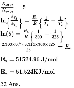 The rate constant of a reaction increases by five times on increase in temperature from $27^{\circ} \mathrm{C}$ to $52^{\circ} \mathrm{C}$. The value of activation energy in $\mathrm{kJmol}^{-1}$ is ___________(Rounded off to the nearest integer)