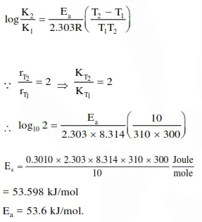 The rate of a reaction doubles when its temperature changes from $300 \mathrm{~K}$ to $310 \mathrm{~K}$. Activation energy of such a reaction will be