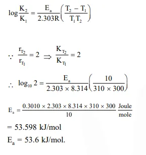 The rate of a reaction doubles when its temperature changes from $300 \mathrm{~K}$ to $310 \mathrm{~K}$. Activation energy of such a reaction will be