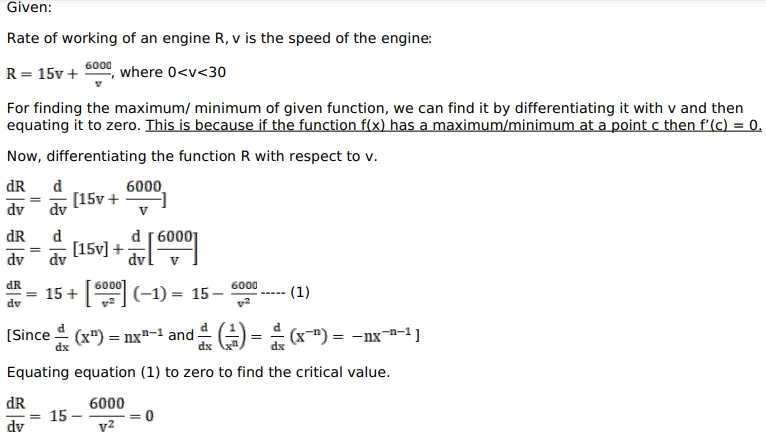 $R=15 v+\frac{6000}{v}$, where $0 and $v$ is the speed of the engine. Show that $R$ is the least when $v=20$.