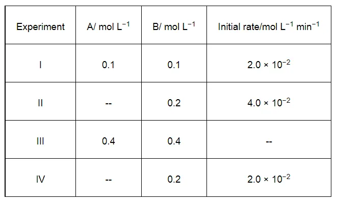 The reaction between A and B is first order with respect to A and zero order with respect to B. Fill in the blanks in the following table: