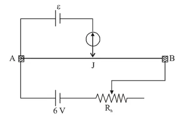 The resistance of the meter bridge $\mathrm{AB}$ in given figure is $4 \Omega$. With a cell of emf $\varepsilon=0.5 \mathrm{~V}$ and rheostat resistance $\mathrm{R}_{\mathrm{h}}=$ $2 \Omega$ the null point is obtained at some point $\mathrm{J}$. When the cell is replaced by another one of $\mathrm{emf} \varepsilon=\varepsilon_{2}$ the same null point $\mathrm{J}$ is found for $\mathrm{R}_{\mathrm{h}}=6 \Omega$. The emf $\varepsilon_{2}$ is,
