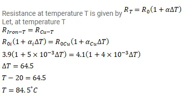 The resistances of an iron wire and a copper wire at $20^{\circ} \mathrm{C}$ are $3.9 \Omega$ and $4.1 \Omega$ respectively. At what temperature will the resistances be equal? Temperature coefficient of resistivity for iron is $5.0 \times 10^{-3} \mathrm{~K}^{-1}$ and for copper it is $4.0 \times 10^{-3} \mathrm{~K}^{-1}$. Neglect any thermal expansion.