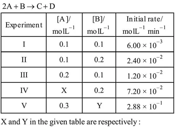 $\Rightarrow \frac{6.0 \times 10^{-3}}{288 \times 10^{-3}}=\left(\frac{0.1}{0.3}\right)^{\mathrm{a}}\left(\frac{0.1}{\mathrm{Y}}\right)^{\mathrm{b}}$
