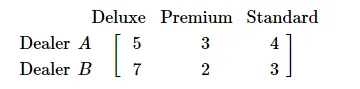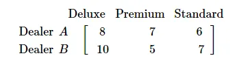 Total sales over the period of January-February reveals that dealer A sold 8 deluxe cars, 7 premium cars and 6 standard cars, while dealer B sold 10 deluxe cars, 5 premium cars and 7 standard cars.