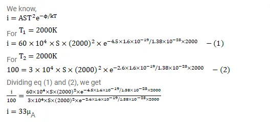 equation is $60 \times \frac{10^{4} \mathrm{~A}}{\mathrm{~m}^{2}}-\mathrm{K}^{2}$ for pure tungsten and $3.0 \times \frac{10^{4} \mathrm{~A}}{\mathrm{~m}^{2}}-\mathrm{K}^{2}$