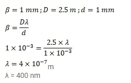 The separation between the consecutive dark fringes in a Young's double slit experiment is $1.0 \mathrm{~mm}$. The screen is placed at a distance of $2.5 \mathrm{~m}$ from the slits and the separation between the slits is $1.0 \mathrm{~mm}$. Calculate the wavelength of light used for the experiment.