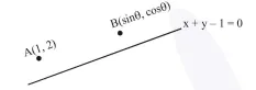 So, $\left(\begin{array}{l}\text { Put }(1,2) \text { in } \\ \text { given line }\end{array}\right)\left(\begin{array}{l}\text { Put }(\sin \theta, \cos \theta \text { in } \\ \text { given line }\end{array}\right)>0$