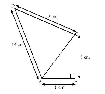 In the given figure, ABCD is a quadrilateral with sides of length 6 cm, 8 cm, 12 cm and 14 cm respectively and the angle between the first two sides is a right angle.