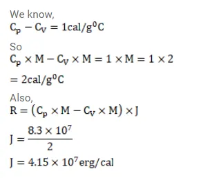 The specific heat capacities of hydrogen at constant volume and at constant pressure are $2.4 \mathrm{cal} / \mathrm{g}-{ }^{\circ} \mathrm{C}$ and $3.4 \mathrm{cal} / \mathrm{g}-{ }^{\circ} \mathrm{C}$ respectively, The molecular weight of hydrogen is $2 \mathrm{~g} / \mathrm{mol}$ and the gas constant $R$ $=8.3 \times 10^{7} \mathrm{erg} / \mathrm{mol}{ }^{\circ} \mathrm{c}$. Calculate the value of $\mathrm{J}$.