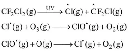 In presence of sunlight CFC's molecule divides and release chlorine free radical, which react with ozone give chlorine monoxide radical $\left(\mathrm{ClO}^{\circ}\right)$ and oxygen.