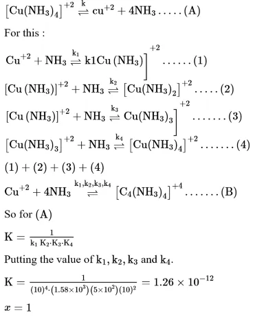 $\mathrm{Cu}^{2+}+\mathrm{NH}_{3} \stackrel{\mathrm{K}_{1}}{\Longrightarrow}\left[\mathrm{Cu}\left(\mathrm{NH}_{3}\right)_{4}\right]^{2+}$$\left[\mathrm{Cu}\left(\mathrm{NH}_{3}\right)_{2}\right]^{2+}+\mathrm{NH}_{3} \stackrel{\mathrm{K}_{2}}{\Longrightarrow}\left[\mathrm{Cu}\left(\mathrm{NH}_{3}\right)_{2}\right]^{2+}$$\left[\mathrm{Cu}\left(\mathrm{NH}_{3}\right)_{2}\right]^{2+}+\mathrm{NH}_{3} \stackrel{\mathrm{k}_{3}}{=}\left[\mathrm{Cu}\left(\mathrm{NH}_{3}\right)_{3}\right]^{2+}$$\left[\mathrm{Cu}\left(\mathrm{NH}_{3}\right)_{3}\right]^{2+}+\mathrm{NH}_{3} \stackrel{\mathrm{k}_{4}}{\Longrightarrow}\left[\mathrm{Cu}\left(\mathrm{NH}_{3}\right)_{4}\right]^{2+}$The value of stability constants $K_{1}, K_{2}, K_{3}$ and $K_{4}$ are $10^{4}, 1.58 \times 10^{2}, 5 \times 10^{2}$ and $10^{2}$respectively. The overall equilibrium constants for dissociation of $\left[\mathrm{Cu}\left(\mathrm{NH}_{3}\right)_{4}\right]^{2+}$ is $\mathrm{x} \times 10^{-12}$. The value of $x$ is________ . (Rounded off to the nearest integer)