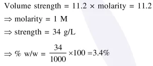 Question: The strength of $11.2$ volume solution of $\mathrm{H}_{2} \mathrm{O}_{2}$ is : [Given that molar mass of $\mathrm{H}=1 \mathrm{~g} \mathrm{~mol}^{-1}$ and $\mathrm{O}=16 \mathrm{~g} \mathrm{~mol}^{-1}$ ]