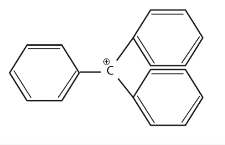 Triphenylcarbocation is tertiary carbocation and the positive charge is on the carbon atom which is stabilized by the three phenyl group by resonance. Due to the