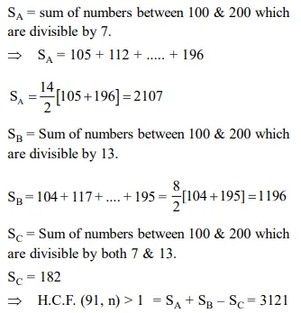 The sum of all natural numbers ' $n$ ' such that $100<\mathrm{n}<200$ and H.C.F. $(91, \mathrm{n})>1$ is :