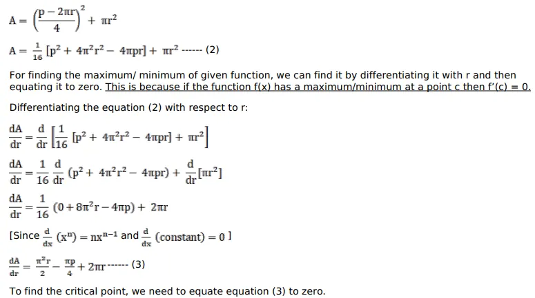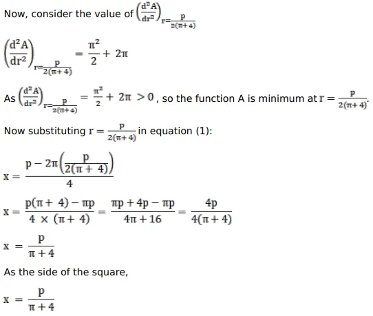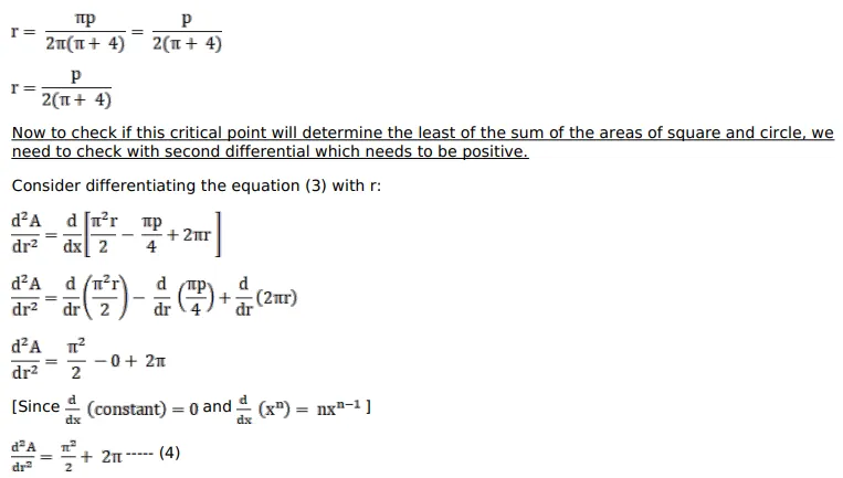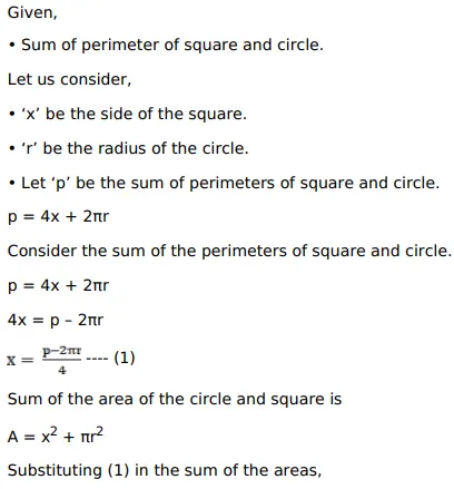 The sum of the perimeters of a square and a circle is given. Show that the sum of their areas is least when