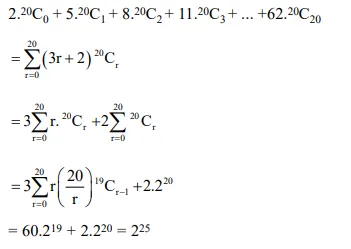 $2 \cdot{ }^{20} \mathrm{C}_{0}+5 \cdot{ }^{20} \mathrm{C}_{1}+8 \cdot{ }^{20} \mathrm{C}_{2}+11 .{ }^{20} \mathrm{C}_{3}+\ldots+62 . \cdot{ }^{20} \mathrm{C}_{20}$
