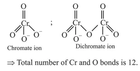 The sum of the total number of bonds between chromium and oxygen atoms in chromate and dichromate ions is _________ .