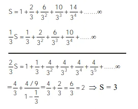The sum to infinity of the series $1+\frac{2}{3}+\frac{6}{3^{2}}+\frac{10}{3^{3}}+\frac{14}{3^{4}}+\ldots$ is :-