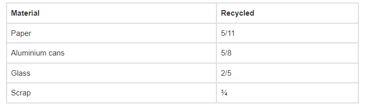 The table shows the portion of some common materials that are recycled.