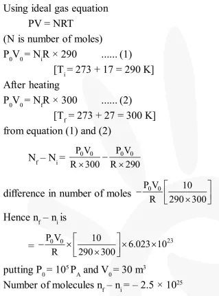 The temperature of an open room of volume $30 \mathrm{~m}^{3}$ increases from $17^{\circ} \mathrm{C}$ to $27^{\circ} \mathrm{C}$ due to sunshine. The atmospheric pressure in the room remains $1 \times 10^{5} \mathrm{~Pa}$. If $\mathrm{n}_{\mathrm{i}}$ and $\mathrm{n}_{\mathrm{f}}$ are the number of molecules in the room before and after heating, then $n_{f}-n_{i}$ will be :-
