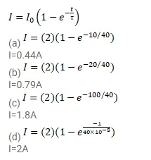The time constant of an LR circuit is $40 \mathrm{~ms}$. The circuit is connected at $t=0$ and the steady-current is found to be $2.0 \mathrm{~A}$. Find the current at