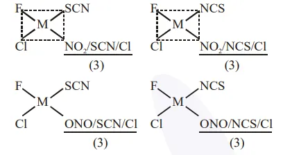 The total number of isomers for a square planar complex $\left[\mathrm{M}(\mathrm{F})(\mathrm{Cl})(\mathrm{SCN})\left(\mathrm{NO}_{2}\right)\right]$ is :
