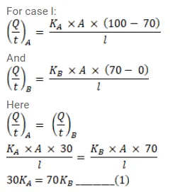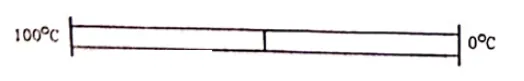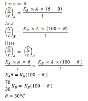 The two rods shown in figure have identical geometrical dimensions. They are in contact with two heat baths at temperatures $100^{\circ} \mathrm{C}$ and $0^{\circ} \mathrm{C}$ The temperature of the junction is $70^{\circ} \mathrm{C}$. Find the temperature of the junction if the rods are interchanged.
