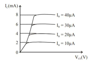 $\beta=\frac{\Delta \mathrm{I}_{\mathrm{C}}}{\Delta \mathrm{I}_{\mathrm{B}}}=\frac{2 \times 10^{-3}}{10 \times 10^{-6}}$