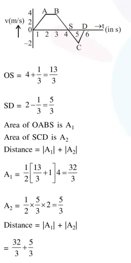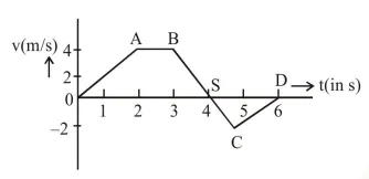 The velocity (v) and time (t) graph of a body in a straight line motion is shown in the figure. The point $\mathrm{S}$ is at $4.333$ seconds. The total distance covered by the body in $6 \mathrm{~s}$ is :