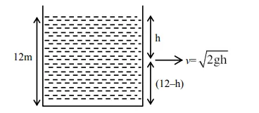 The water is filled upto height of 12 m in a tank having vertical sidewalls. A hole is made in one of the walls at a depth 'h' below the water level. The value of 'h' for which the emerging stream of water strikes the ground at the maximum range is ___ m.