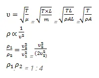 The wires of different densities but same area of cross section are soldered together at one end and are stretched to a tension $\mathrm{T}$. The velocity of a transverse wave in the first wire is double of that in the second wire. Find the ratio of the density of the first wire to that of the second wire.