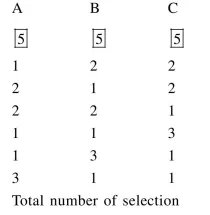 $=\left({ }^{5} \mathrm{C}_{1}{ }^{5} \mathrm{C}_{2}{ }^{5} \mathrm{C}_{2}\right) \cdot 3+\left({ }^{5} \mathrm{C}_{1}{ }^{5} \mathrm{C}_{1}{ }^{5} \mathrm{C}_{3}\right) \cdot 3$