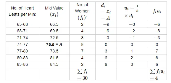 Now, we have $N=\sum f_{i}=30, \sum f_{i} u_{i}=4, h=3$ and $A=75.5$.