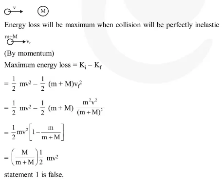 Statement - I : A point particle of mass m moving with speed v collides with stationary point particle of mass M. If the maximum energy loss possible is given as $f\left(\frac{1}{2} m v^{2}\right)$ then $f=\left(\frac{m}{M+m}\right)$.