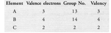 Three elements A, B and C have 3, 4 and 2 electrons respectively in their outermost shell. Give the group number to which they belong in the Modern