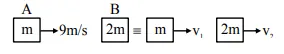 $\mathrm{m} \times 9=\mathrm{mv}_{1}+2 \mathrm{mv} \mathrm{v}_{2}$ (from momentum conservation)