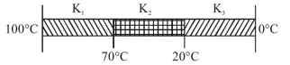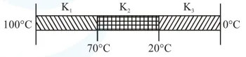 $\frac{(100-70) \mathrm{K}_{1} \mathrm{~A}}{\ell}=\frac{(70-20) \mathrm{K}_{2} \mathrm{~A}}{\ell}=\frac{(20-0) \mathrm{K}_{3} \mathrm{~A}}{\ell}$