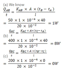 Three rods of lengths $20 \mathrm{~cm}$ each and area of cross - section $1 \mathrm{~cm}^{2}$ are joined to form a triangle $A B C$. The conductivities of the rods are $\mathrm{K}_{\mathrm{AC}}=50 \mathrm{~J} / \mathrm{m}-\mathrm{s}-{ }^{\circ} \mathrm{C}, \mathrm{K}_{\mathrm{BC}}=200 \mathrm{~J} / \mathrm{m}-\mathrm{s}-{ }^{\circ} \mathrm{C}$ and $\mathrm{K}_{\mathrm{AC}}=400 \mathrm{~J} / \mathrm{m}-\mathrm{s}-{ }^{\circ} \mathrm{C}$. Then junctions $\mathrm{A}, \mathrm{B}$ and $\mathrm{C}$ are maintained at $40^{\circ} \mathrm{C}, 80^{\circ} \mathrm{C}$ and $80^{\circ} \mathrm{C}$ respectively. Find the rate of heat flowing through the rods $A B, A C$ and $B C$.