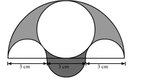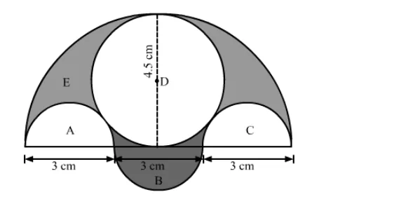 Three semicircles each of diameter 3 cm, a circle of diameter 4.5 cm and a semicircle of radius 4.5 cm