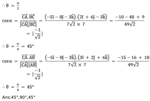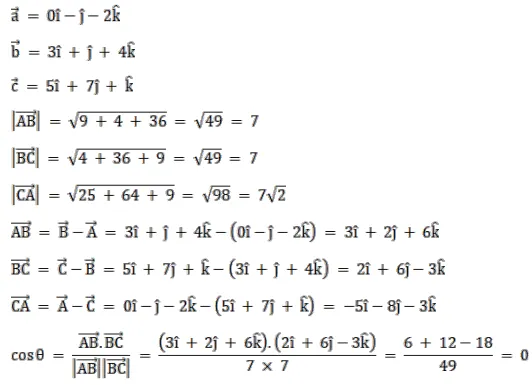 Three vertices of a triangle are $A(0,-1,-2), B(3,1,4)$ and $C(5,7,1)$. Show that it is a right - angled triangle. Also, find its other two angles.