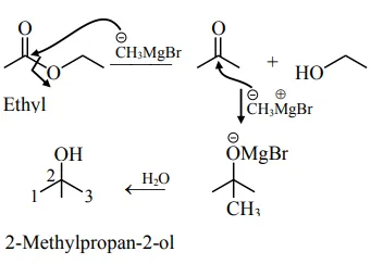 To synthesise $1.0$ mole of 2 -methylpropan-2-ol from Ethylethanoate equivalents of $\mathrm{CH}_{3} \mathrm{MgBr}$ reagent will be required. (Integer value)