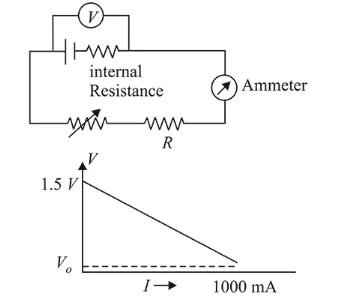 To verify Ohm's law, a student connects the voltmeter across the battery as, shown in the figure. The measured voltage is plotted as a function of the current, and the following graph is obtained :
