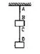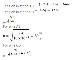 Two blocks each having a mass of $3.2 \mathrm{~kg}$ are connected by a wire CD and the system is suspended from the ceiling by another wire $A B$. The linear mass density of the wire $A B$ is $10 \mathrm{~g} / \mathrm{m}$ and that of $C D$ is $8 \mathrm{~g} / \mathrm{m}$. Find the speed of transverse wave pulse produced in $A B$ and in $C D$