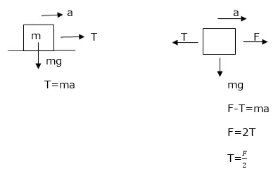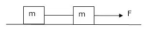 Two blocks of equal mass $m$ are tied to each other through a light string. One of the blocks is pulled along the line joining them with a constant force F. Find the tension in the string joining the blocks.