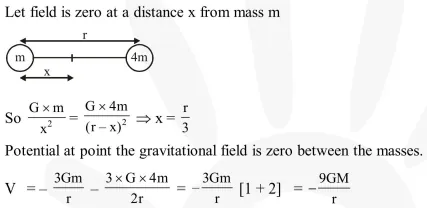 Question: Two bodies of masses $\mathrm{m}$ and $4 \mathrm{~m}$ are placed at a distance $\mathrm{r}$. The gravitational potential at a point on the line joining them where the gravitational field is zero is :-