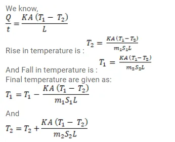 Two bodies of masses $m_{1}$ and $m_{2}$ and specific heat capacities $s_{1}$ and $s_{2}$ are connected by a rod of thermally insulated. At time $t=0$, the temperature of the first body is $T_{1}$ and the temperature of the second body is $T_{2}\left(T_{2}>T_{1}\right)$ Find the temperature difference between the two bodies at time $t$.